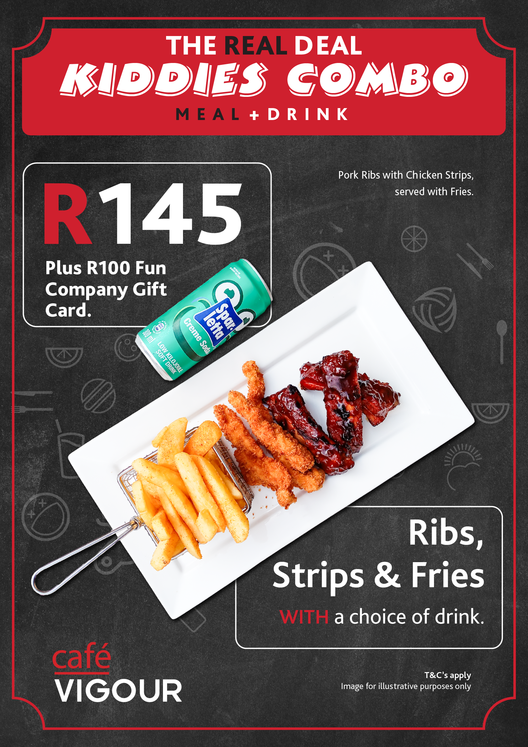 Ribs & Strips (R145): Pork ribs, chicken strips, chips + soft drink
